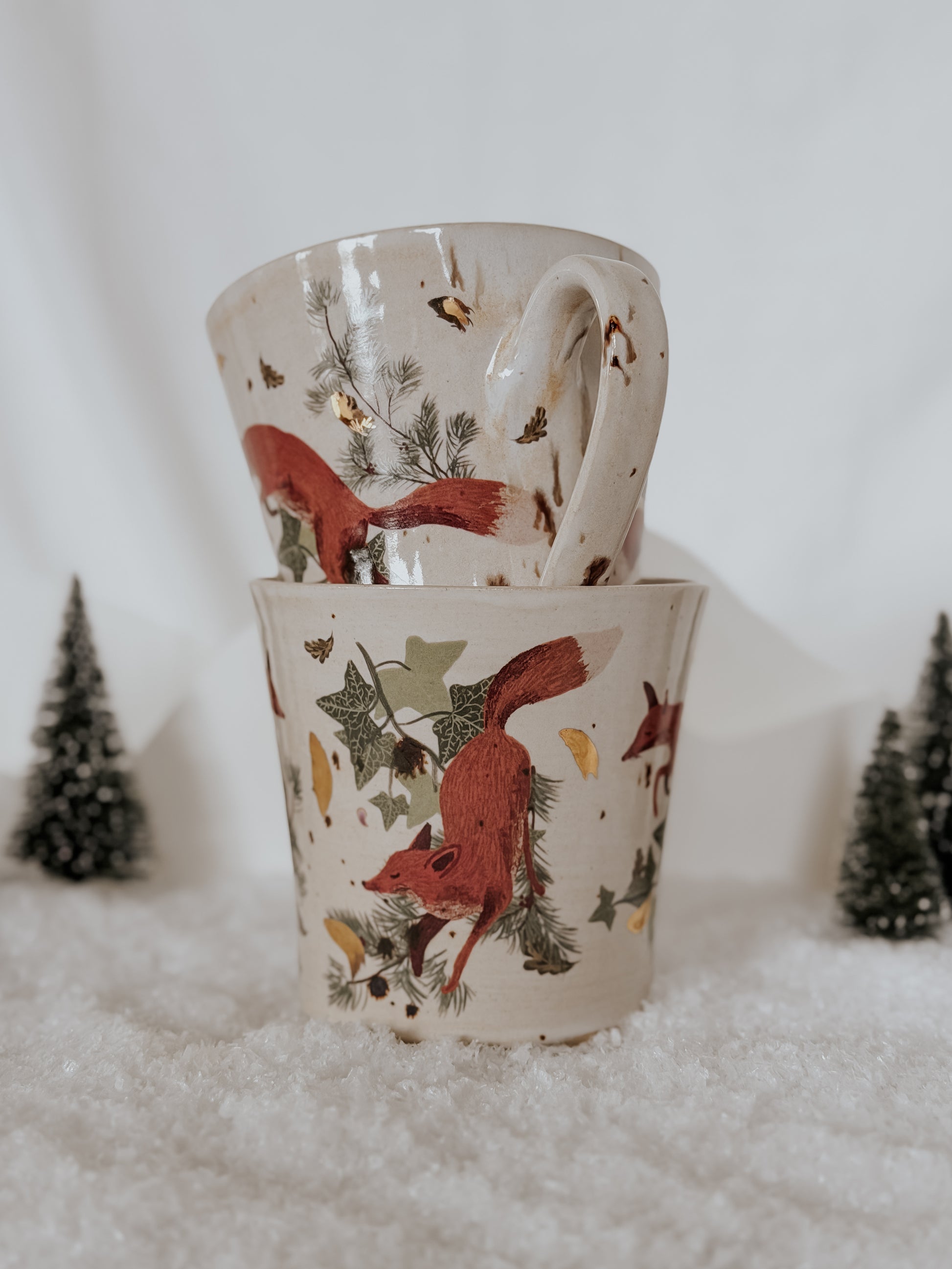 Wheel thrown stoneware mug, finished with a soft white speckled glaze, a beautiful illustrated festive bird scene and gold lustre brushstrokes.