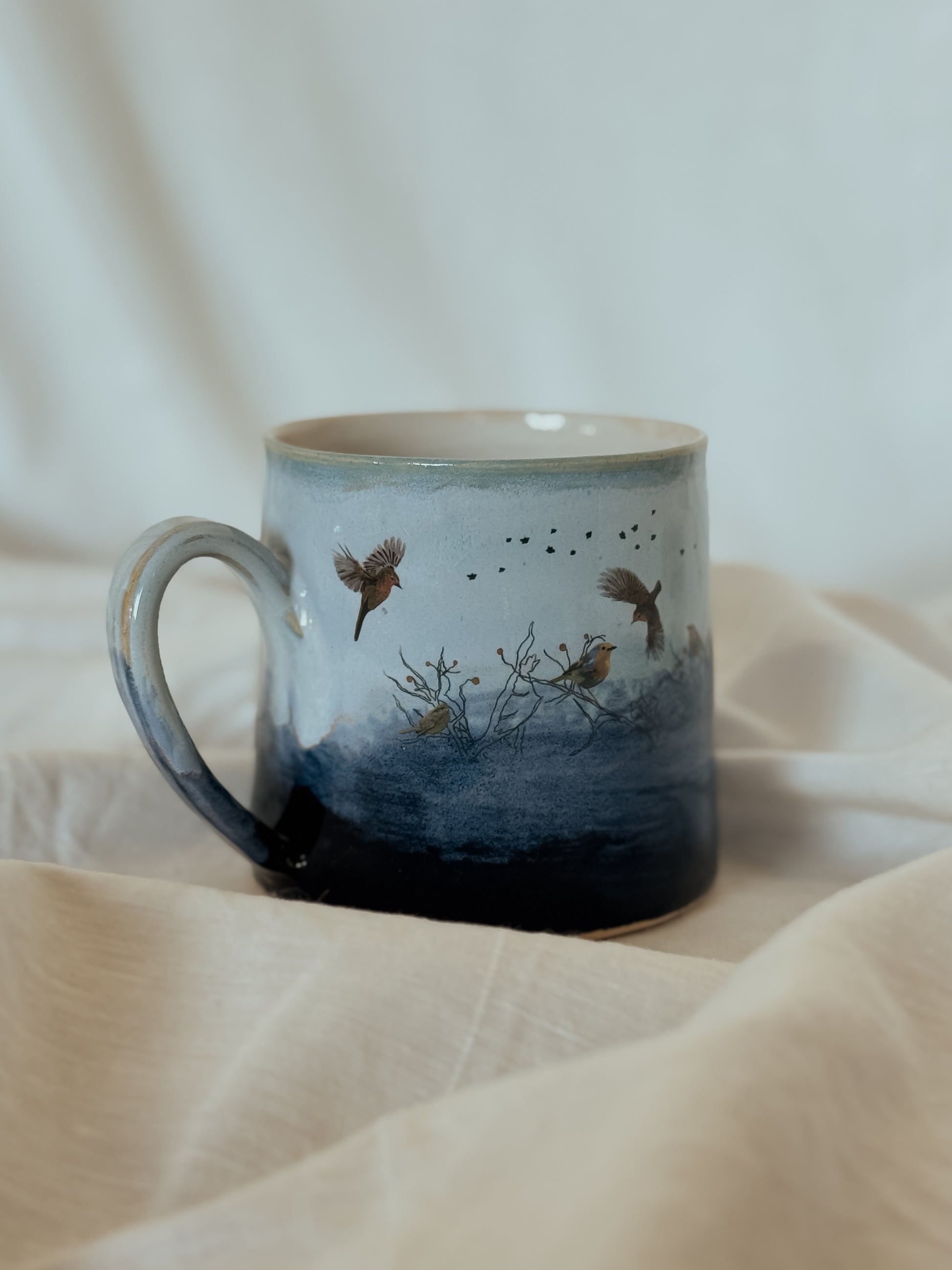 Wheel throw stoneware mug, finished with a beautiful wintery landscape and a twiggy hedgerow filled with sparrows and robins.